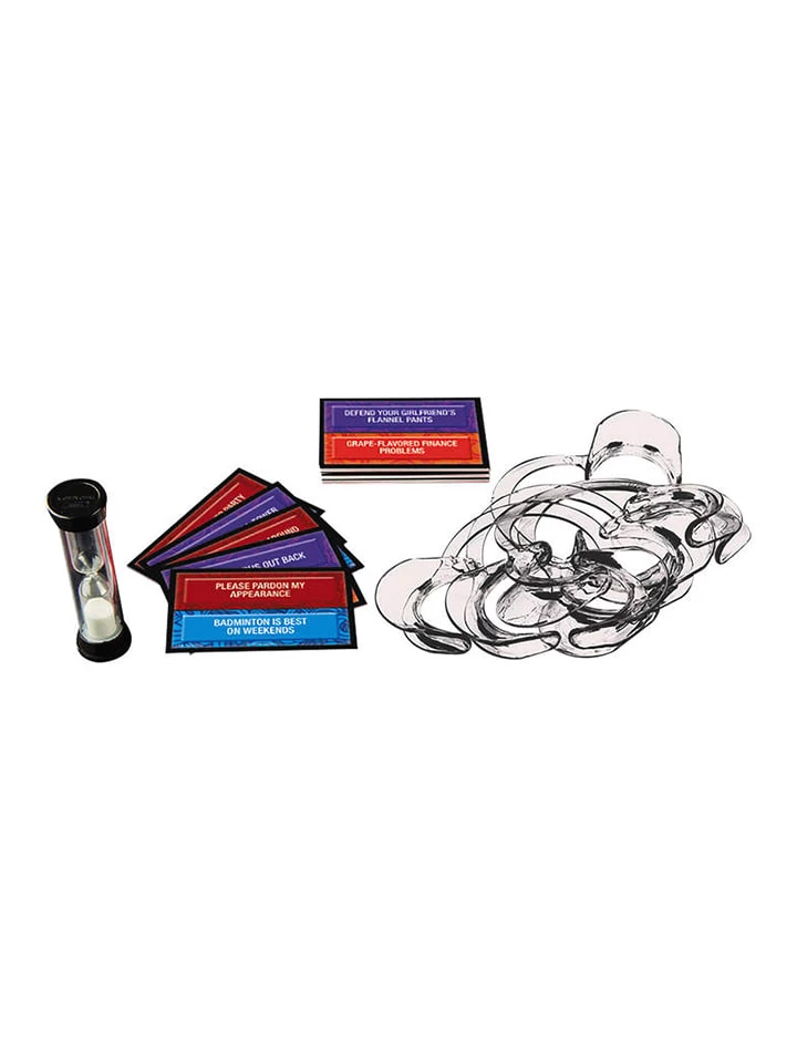 – Inhalt: 100 beidseitig bedruckte Karten mit 400 Sätzen, 8 Mundstücke in zwei Größen (4 für Kinder und 4 für Erwachsene)