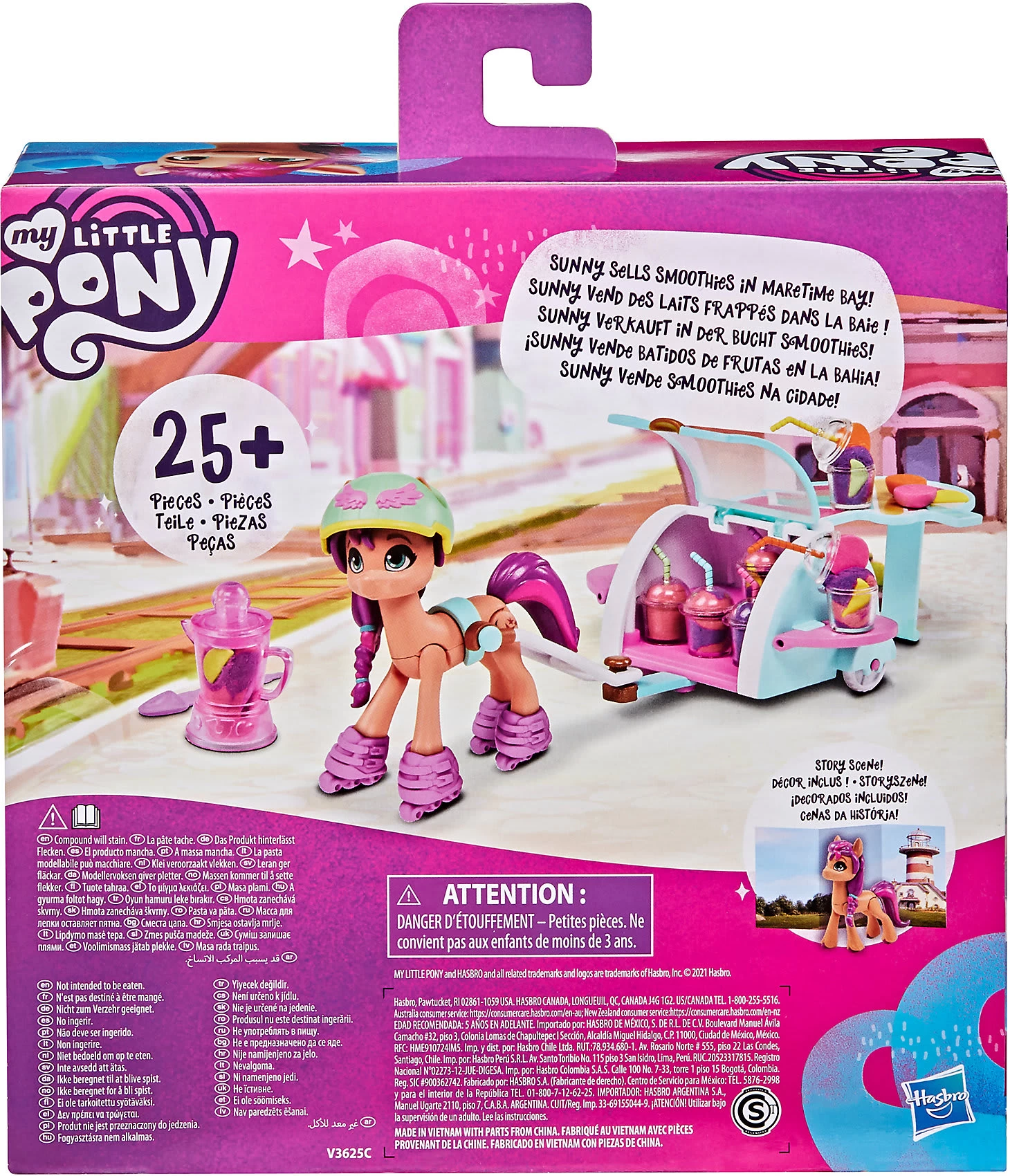 Mit der enthaltenen Storyszene kann Smoothie Shop Sunny Starscout auf jede Menge spannende Abenteuer geschickt werden. Das Set enthält eine 7,5 cm große, orangefarbene Sunny Starscout Ponyfigur mit geformten pinken Haaren. Weiterhin befinden sich im Set über 25 Teile, inklusive toller Accessoires, mit denen die Kinder das Pony anpassen können. Aus der Spielmasse in den 2 enthaltenen Dosen können sogar Spiel-Smoothies gemixt werden Wird die Masse in das Mixer-Accessoire gefüllt, lässt sie sich darin richtig drehen und es entsteht eine bunte Leckerei. Wird die Masse dann in die Becher gefüllt und mit den lustigen Früchten garniert, entsteht ein leckerer Spiel-Smoothie. Dank der enthaltenen Storyszene können Kinder so tun, als ob Sunny wie im Film mit ihrem Wagen Smoothies verkauft.