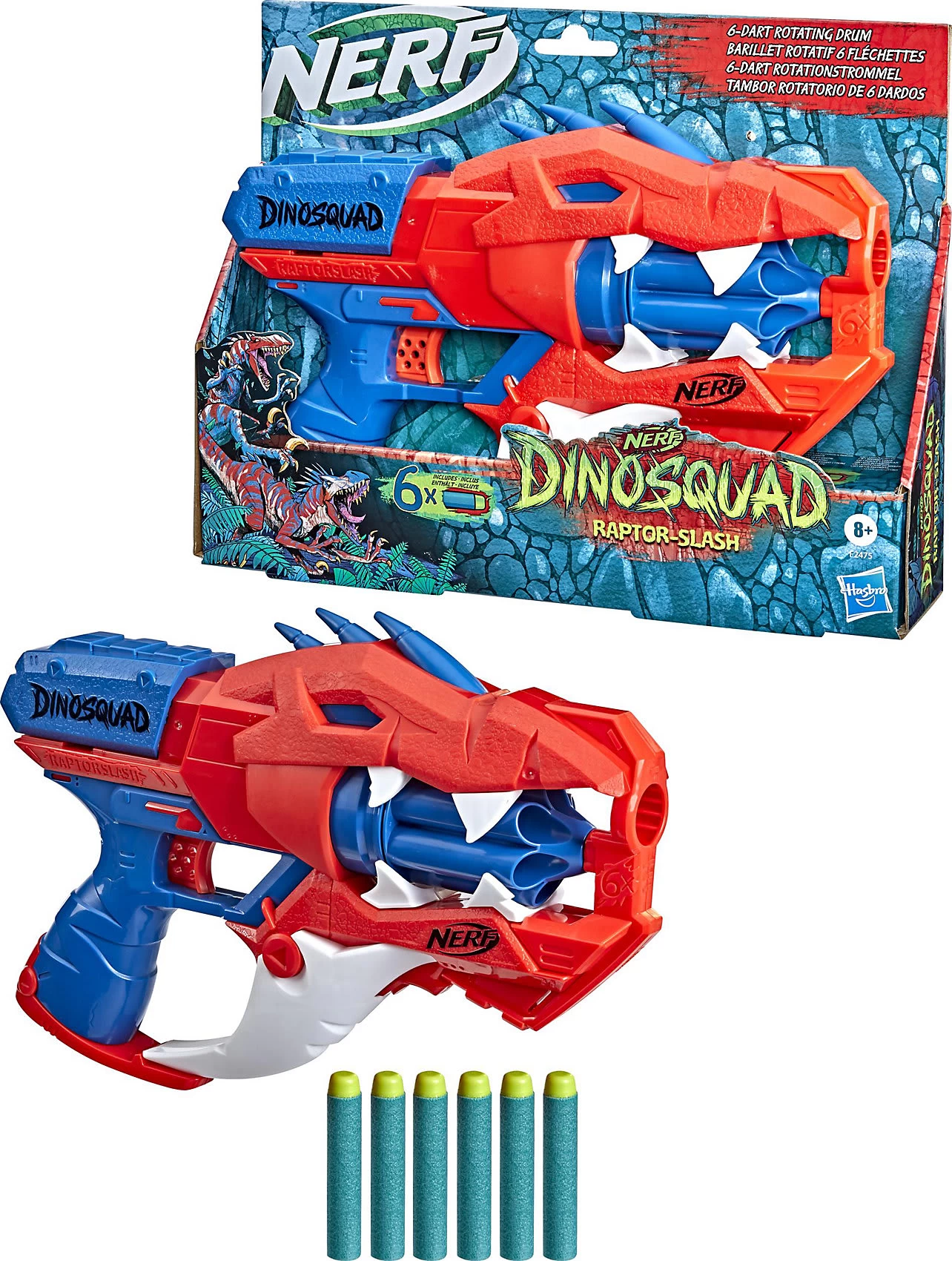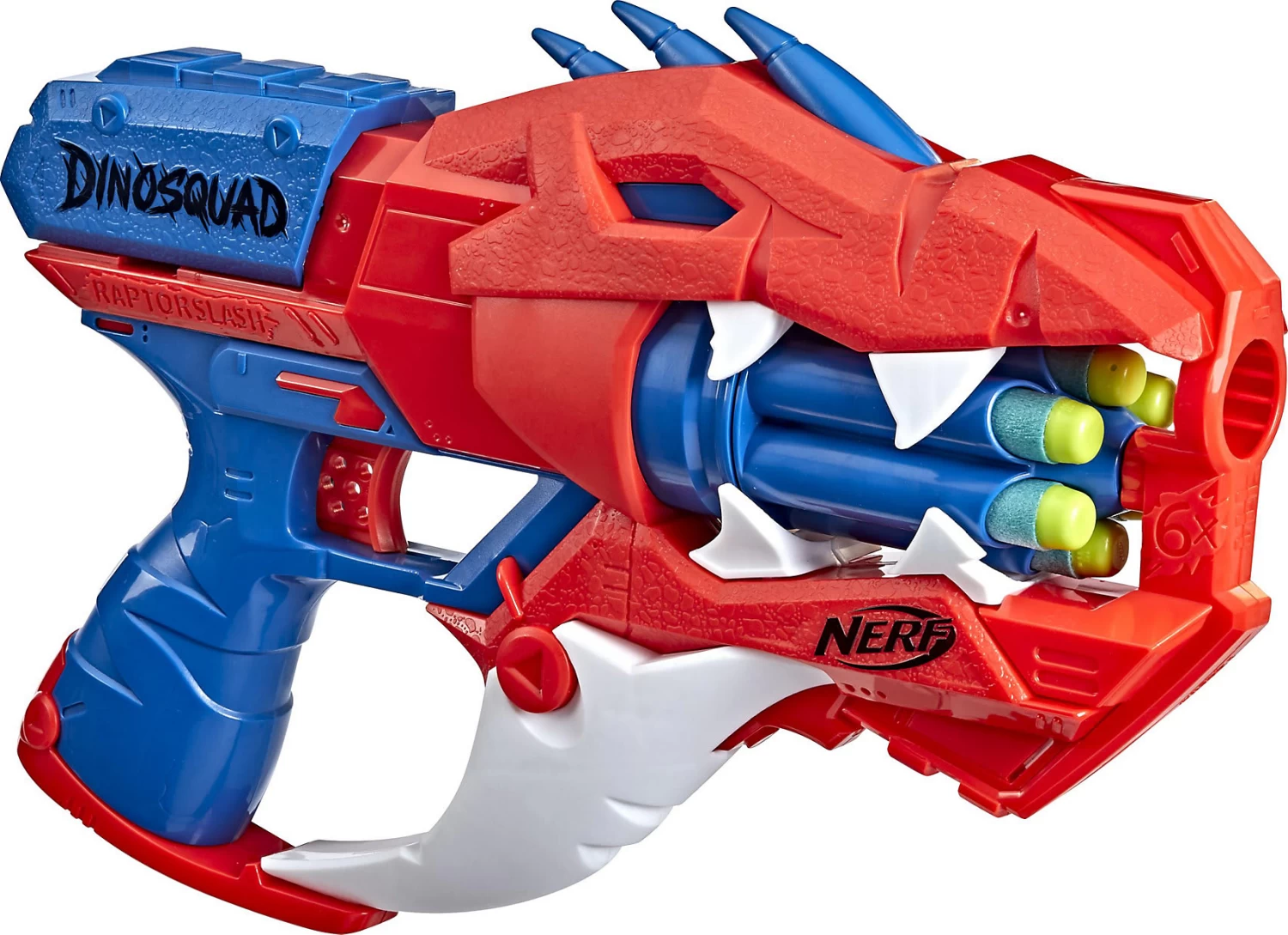 Neue Nerf-Action für alle Dino-Fans! Der DinoSquad Raptor-Slash Dart-Blaster von Hasbro kommt mit saurierstarken Details und überzeugt im coolen Velociraptor-Look. Der Blaster hat eine 6-Dart Rotationstrommel und einen Schnellfeuer-Modus, der es erlaubt die 6 beiliegenden Darts nacheinander abzufeuern. Die Darts schießen dann entweder nacheinander einzeln oder im Schnellfeuer-Modus aus dem Dino-Maul. Die Trommel wird geladen, der Spannschlitten bewegt und der Abzug gedrückt, um einen Dart abzufeuern. Die Schnellfeuer-Action sorgt für einen schnellen Dart-Hagel. Um alle 6 Darts schnell abzufeuern, wird der Abzug gedrückt gehalten und der Spannschlitten vor- und zurückbewegt. Die Nerf Elite Darts sind aus Schaumstoff gefertigt und für Indoor- und Outdoor-Action geeignet.