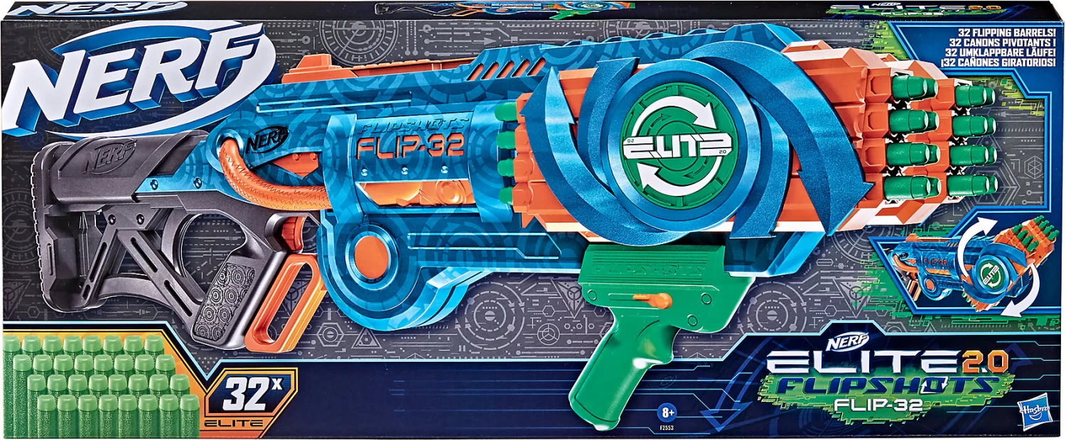 Der Nerf Elite 2.0 Flipshots Flip-32 Blaster sorgt für actionreiche Battles! Der Blaster hat 32 Läufe – 16 zeigen nach vorne und 16 nach hinten. Es können Darts aus den 16 nach vorne zeigenden Läufen abgefeuert werden, anschließend können die 16 nach hinten zeigenden Läufe vorgeklappt werden, um weiterzufeuern. Wenn die Mitspielenden denken, die Läufe seien leer, können sie so mit 16 weiteren geladenen Läufen überrascht werden. Die in unterschiedliche Richtungen zeigenden Läufe sind miteinander verbunden, sodass sie einfach gedreht werden können, indem am Griff gezogen wird. Es können ein oder zwei Darts auf einmal abgefeuert werden. Der Abzug wird bis zur Hälfte gedrückt, um einen Dart abzufeuern oder es werden zwei Darts auf einmal abgefeuert, indem der Abzug bis zum Anschlag gedrückt wird. Der Blaster bietet Hebel-Action. Jeder Lauf enthält einen Dart, sodass der Blaster eine Kapazität von 32 Darts hat. Ein Augenschutz wird empfohlen (nicht enthalten).