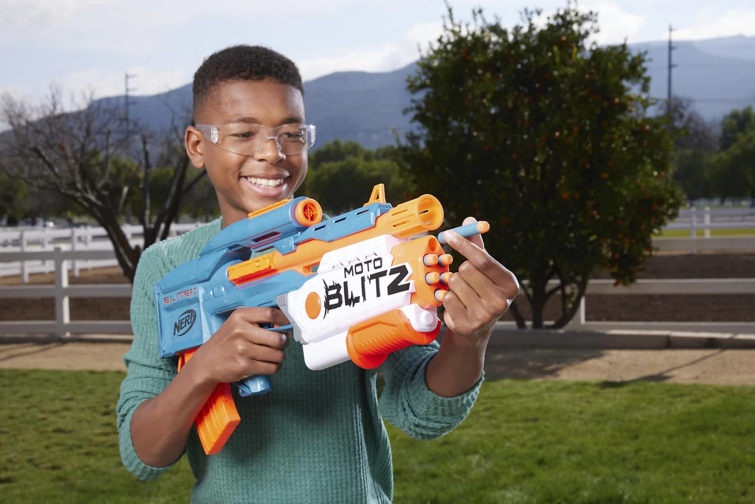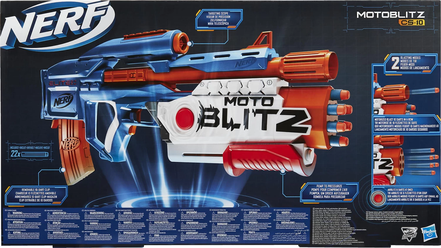 Neue Möglichkeiten mit diesem Blaster von Hasbro. Der Nerf Elite 2.0 Motoblitz begeistert mit gleich zwei verschiedenen Spielmodi. mit Hilfe von Pumpgriff und Airblitz-Knopf können gleich sechs Darts auf einmal oder zehn hintereinander abgefeuert werden. Mit dieser Ausstattung haben Gegner*innen keine Chance. Gleich zweiundzwanzig Darts sind im Lieferumfang enthalten und Kids können gleich in das erste match starten und die neue Pistole ausprobieren.