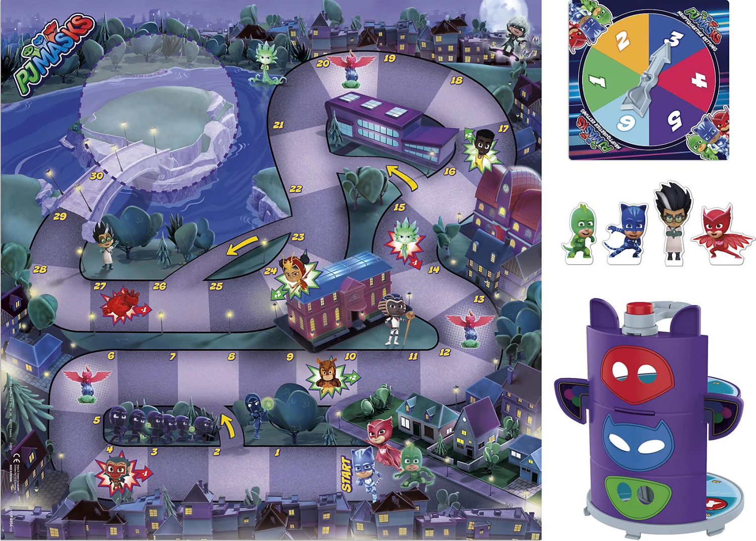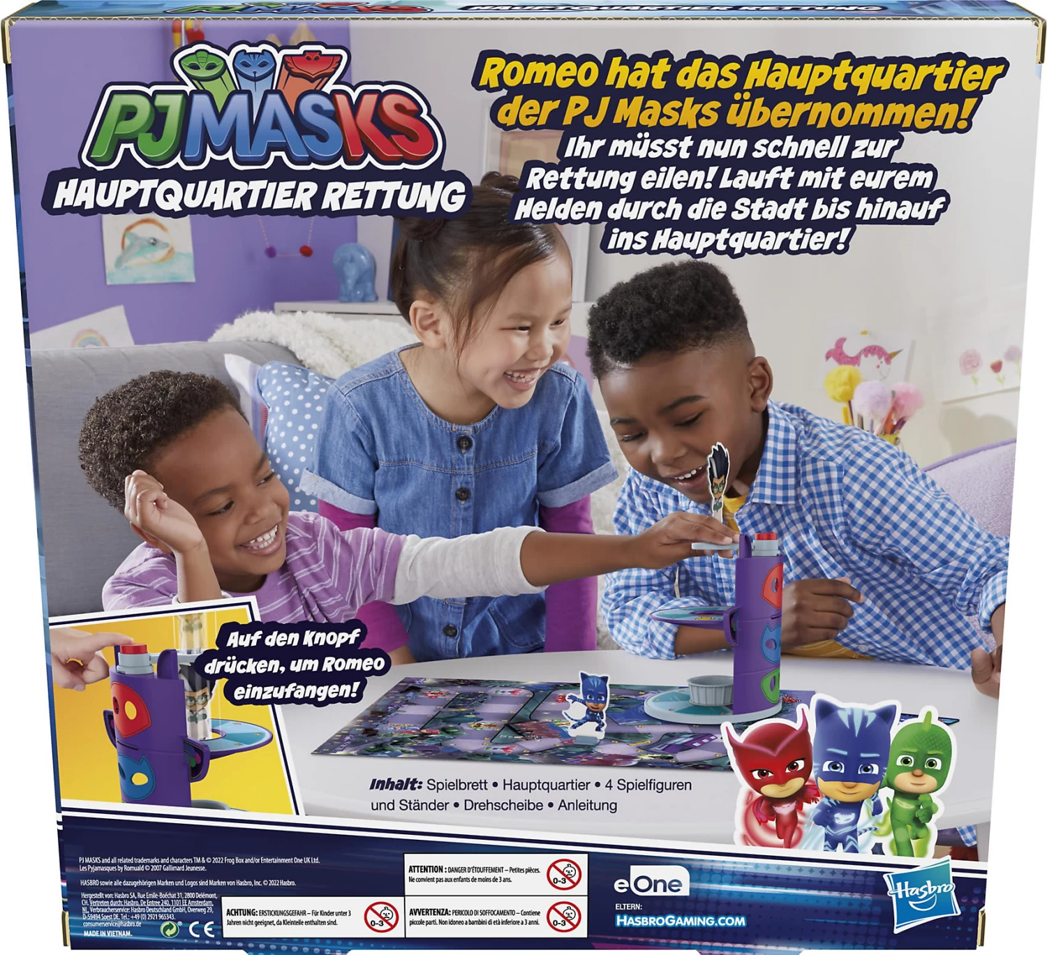Mit diesem farbenfrohen Brettspiel kommt Spielespaß für alle PJ Masks Fans in die Kinderzimmer. Romeo hat das Hauptquartier der kleinen Pyjamahelden übernommen. Mit den Spielefiguren Catboy, Gecko oder Eulette geht es nun zum Turm, um das Hauptquartier wieder zurückzuerobern. Das Spiel enthält einen HQ-Turm aus Kunststoff, der auf den Spielplan gestellt wird. Sobald ein Pyjamaheld es um das Spielfeld und bis auf den Turm geschafft hat, kann er Romeo gefangen nehmen und so seinen Gewinn feiern. Durch Drücken des roten Knopfs auf dem Turm öffnet sich die Kralle und die Romeo Figur fällt in die Falle hinein! Das Spiel PJ Masks HQ Rescue ist ein tolles Brettspiel für Vorschulkinder ab 4 Jahren.