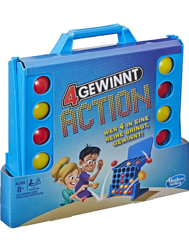 Wer vier in eine Reihe bringt, gewinnt! ‚VIER GEWINNT ACTION‘ ist ein temporeiches Spiel, bei dem es darum geht, die Bälle so schnell wie möglich durch Aufprallen und Springen in eine Reihe zu bringen. Beim Countdown geht’s rund: 1-2-3 Action! Zwei Spieler versuchen gleichzeitig, die leichten Bälle in die Rasterwand zu schleudern. Dabei müssen die Bälle auf dem Tisch aufprallen, bevor sie in die Rasterwand springen. Der Spaß geht weiter, bis ein Spieler 4 Bälle seiner Farbe in eine Reihe bringt und gewinnt. Ist das Spiel vorbei, kann die Rasterwand zu einer handlichen Aufbewahrungsbox zusammengeklappt werden.
